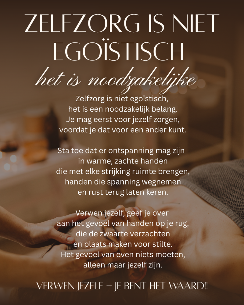 Via de huid, het aanraken, massage wordt de aanmaak van oxytocine gestimuleerd, waardoor je jezelf weer lekkerder in je vel voelt.